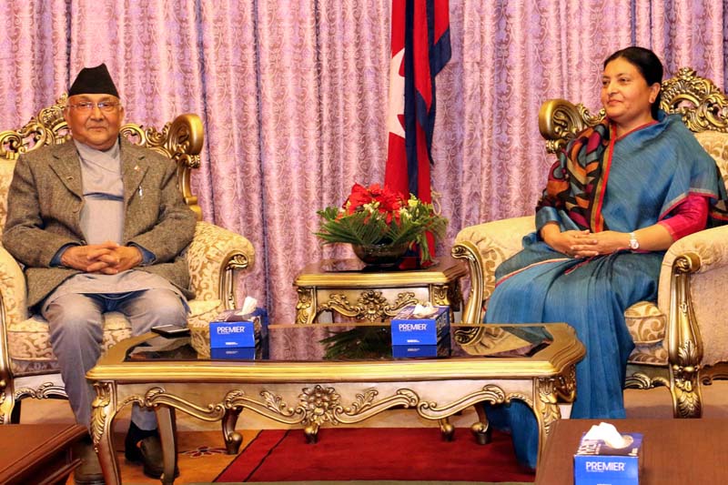 काठमाडाैं । नेकपा (एमाले)का अध्यक्ष एवं प्रधानमन्त्री केपी शर्मा ओली राष्ट्रपति विद्यादेवी भण्डारीलाई भेट्न शीतलनिवास पुगेका छन् । बालुवाटारमा केहीबेर बसेको एमाले स्थायी कमिटी बैठक सकेर