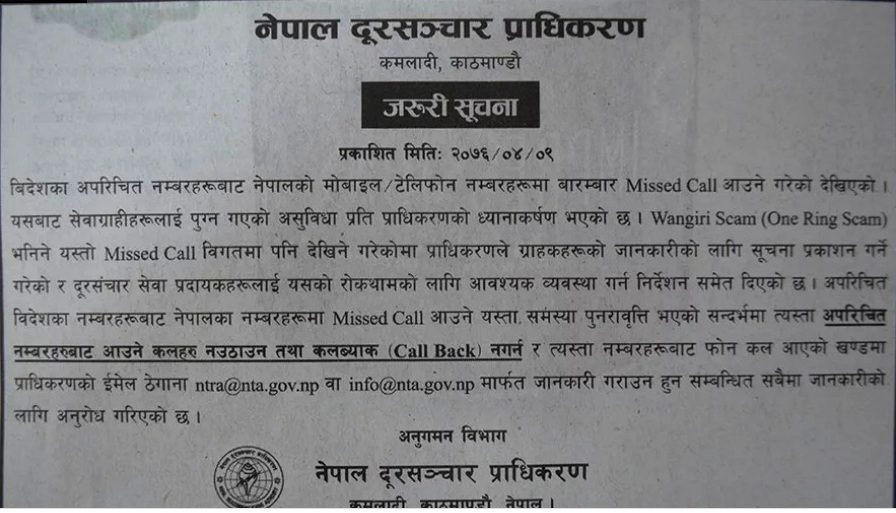 ‘काठमाडौं, ९ साउन । विदेशको नम्बरबाट तपाइँलाई अपरिचितको मिस्डकल वा कल आउने गरेको छ ? यति आउँछ भने नउठाउनुहोला । यस्तो फोन ल्याण्डलाइन या मोबाइल