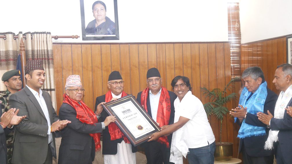 काठमाडौं । प्रधानमन्त्री केपी शर्मा ओलीले समता स्कूल काठमाडौंलाई वल्र्ड बुक अफ रेकर्डस् हस्तान्तरण गर्नुभएको छ । आज बिहान बालुवटारमा आयोजित कार्यक्रममा वल्र्डबुक अफ रेकर्डस