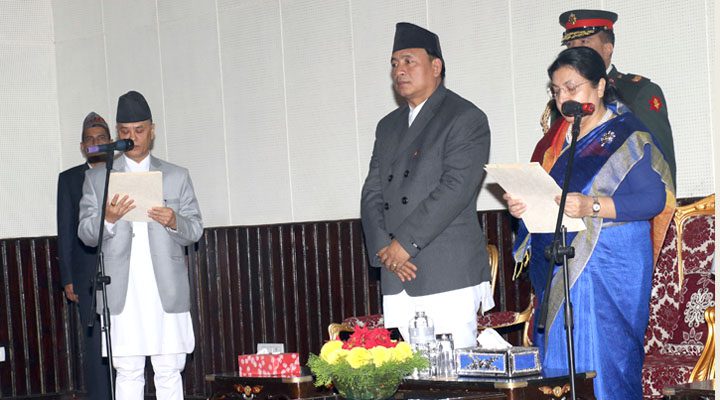 काठमाडौँ । राष्ट्रपति विद्यादेवी भण्डारीले नवनियुक्त प्रधानन्यायाधीश चोलेन्द्रशम्शेर राणालाई पद तथा गोपनीयताको शपथ ग्रहण गराउनुभएको छ । शीतलनिवासस्थित राष्ट्रपति कार्यालयमा आज आयोजना गरिएको विशेष समारोहका