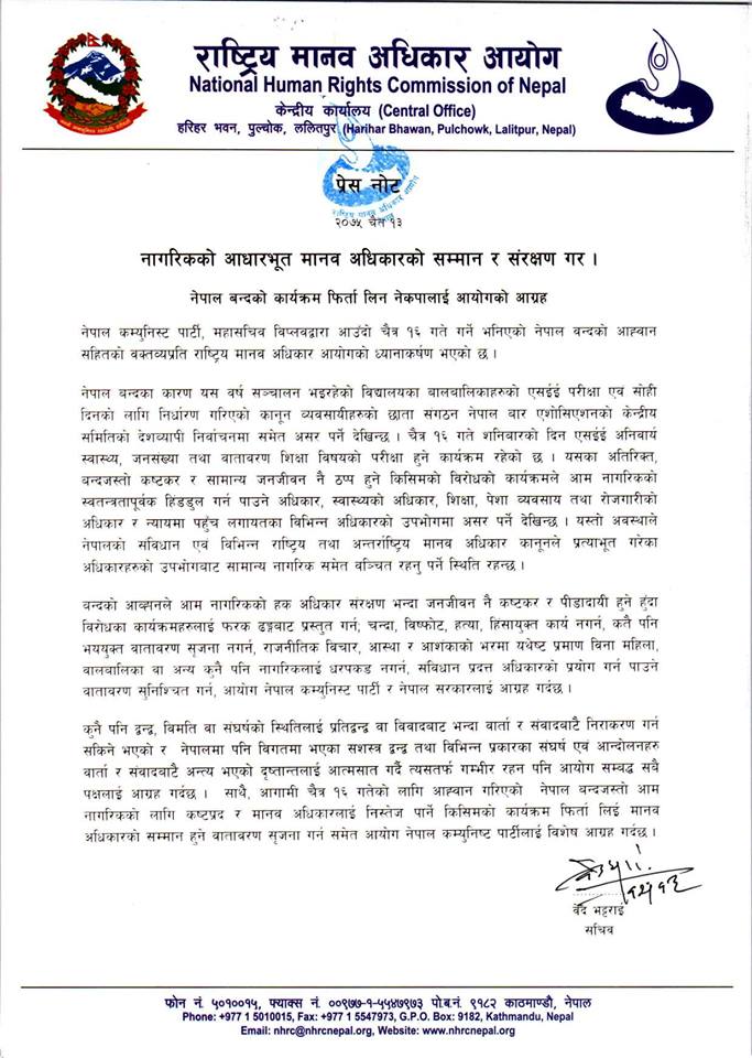 काठमाडौं, १३ चैत । राष्ट्रिय मानवअधिकार आयोगले १६ गतेका लागि आह्वान गरिएको बन्दको कार्यक्रम फिर्ता लिन नेकपा विप्लव समूहलाई आग्रह गरेको छ। बुधबार एक प्रेस