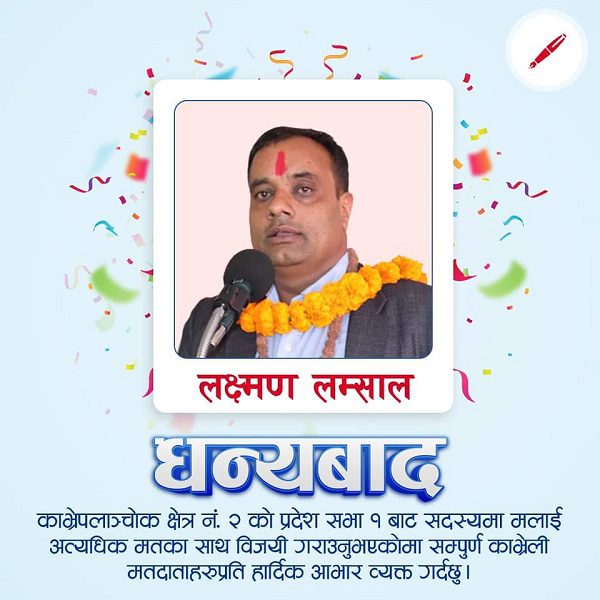 काठमाडौं । काभ्रे क्षेत्र नम्बर २(१) मा नेकपा समाजवादीका उम्मेदवार लक्ष्मण लम्साल विजयी भएका छन् । एमालेका उम्मेदवार कुमार खकुरेललाई १ सय ८८ मतान्तरले पराजित