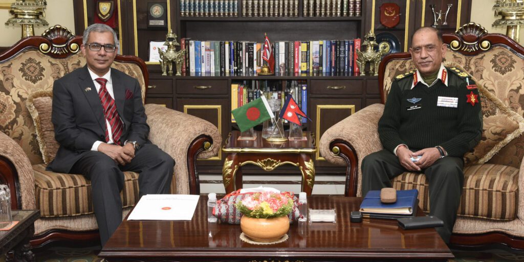 काठमाडौं । प्रधानसेनापति प्रभुराम शर्मा र नेपालका लागि बंगलादेशका राजदूत सलाउदद्धिन नोमन चौधरीबीच बुधबार भेटवार्ता भएको छ । जङ्गी अड्डामा भएको शिष्टाचार भेटघाट दुई पक्षीय