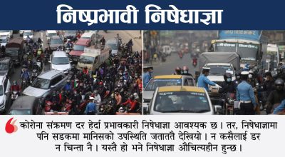 हेडलाइन्स् : १. कोरोना भाइरसको संक्रमणको चेन ब्रेक गर्न भन्दै काठमाडौं उपत्यकामा बिहिवारदेखि निषेधाज्ञा लागु, पहिलो दिन नै निषेधाज्ञा निष्प्रभावी, सडकमा सधैँको झैँ जाम, शुक्रबारदेखि