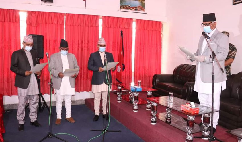 काठमाडौं । कर्णाली प्रदेश सरकारका नवनियुक्त तीन मन्त्रीले सपथ लिएका छन् । कर्णाली प्रदेशका मुख्यमन्त्री महेन्द्रबहादुर शाहीविरुद्ध परेको अविश्वास प्रस्तावको विपक्षमा मतदान गरेपछि मन्त्री बनेका