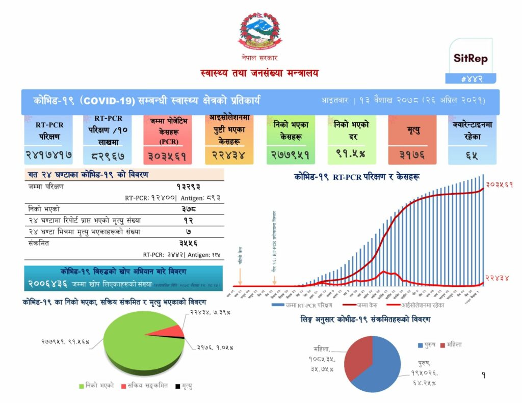 काठमाडाैं । नेपालमा पछिल्लो समय कोरोनाभाइरस (कोभिड–१९) तीव्र गतिमा फैलिँदै गएको छ । पछिल्लो २४ घण्टामा मात्रै नेपालमा तीन हजार पाँच सय भन्दा बढी संक्रमित फेला