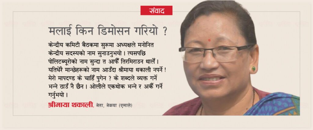 चार दशक नेकपा (एमाले)मा सक्रिय राजनीति गरेका श्रीमाया थकाली पहिलो (तत्कालीन जिल्ला पार्टी प्रमुख) महिला जिल्ला सचिव थिए । मुस्ताङजस्तो जिल्लामा हुनेखाने परिवारमा जन्मेका थकाली
