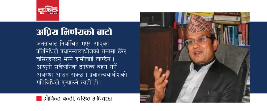 हामी यतिबेला न्यायलय सुधारको अभियानमा छौँ । हामी चरणवद्ध आन्दोलनमा उत्रिनुपर्ने धेरै कारण छन् । त्यस मध्येको पहिलो कारण भनेको प्रधानन्यायाधीश चोलेन्द्रशमशेर जबराले विभिन्न संवैधानिक