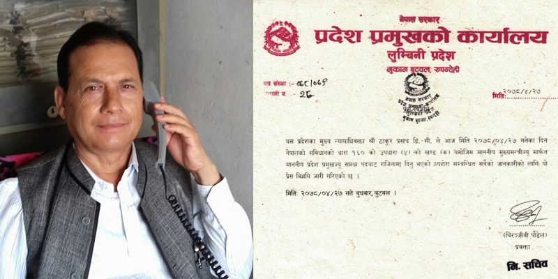 काठमाडाैं । लुम्बिनी प्रदेशका मुख्य न्यायाधीवक्ता ठाकुरप्रसाद डिसीले राजीनामा दिएका छन्। मुख्यमन्त्री शंकर पोखरेलले राजीनामा दिए लगत्तै डिसीले राजीनामा दिएका हुन्। डिसीले नेपालको संविधानको धारा