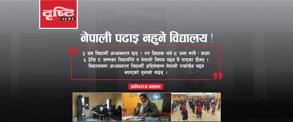 – प्रदीपराज दाहाल धनुषा, ९ माघ । धनुषाको श्री माध्यमिक विद्यालय । जहाँ ९ जना शिक्षक छन् । तर, वर्षौयता कक्षा ६ देखि ८ सम्म